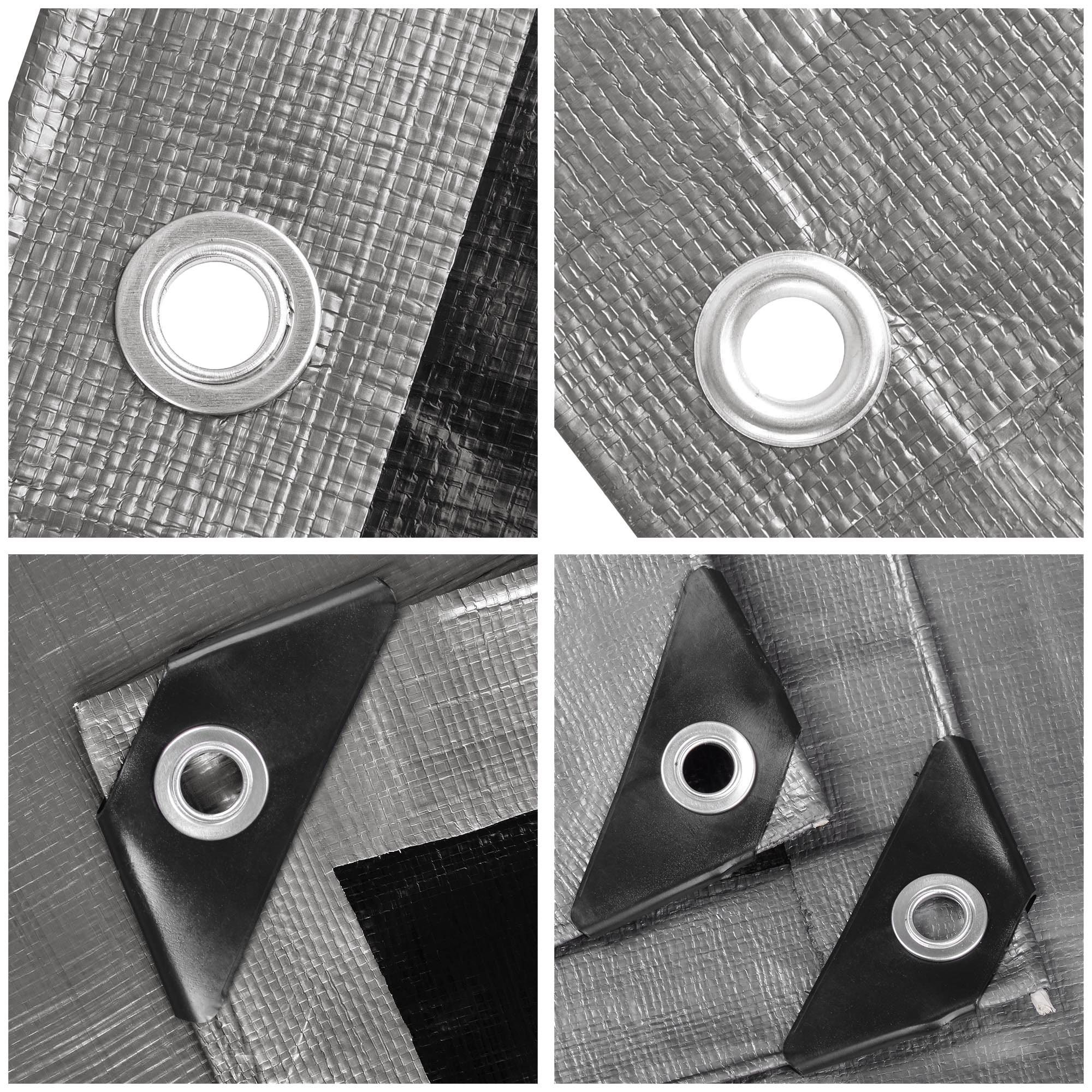 - Sturdy Poly Tarp - 14mil extra heavy-duty thickness and aluminum grommets in 3 1/4 ft (1m) interval for better tear-resistance; weights 27.03Lbs; PP plastics capped reinforced corners with grommets for sturdy construction; All seamless edges avoid water leakage