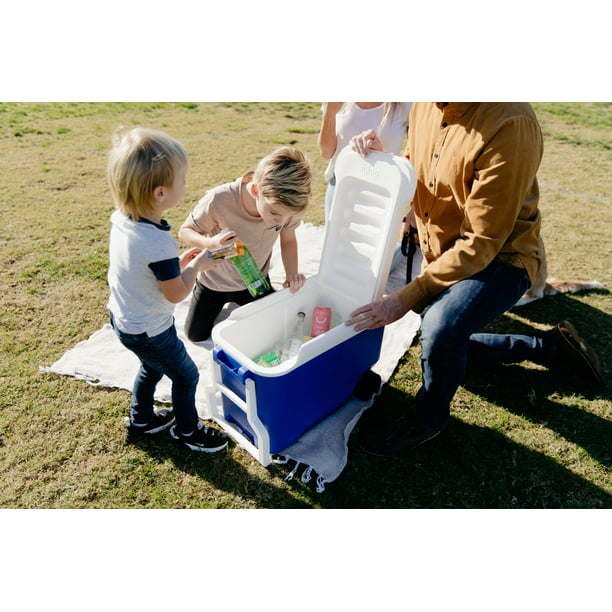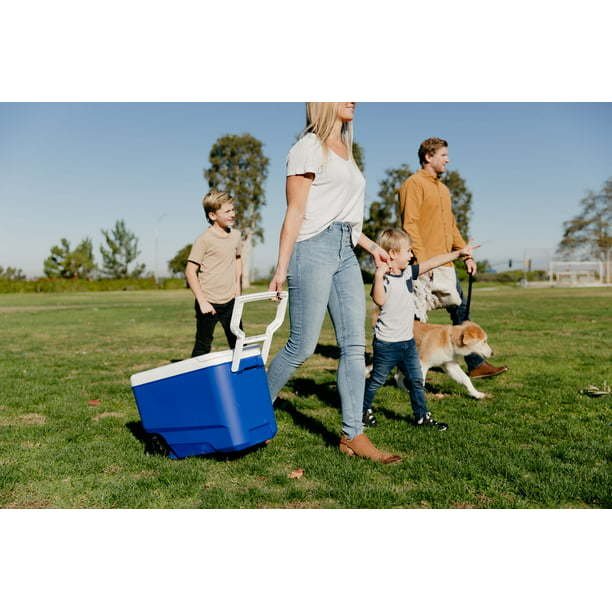 The 38 qt. Hard Sided Roller Rolling Cooler is best classic cooler on wheels! Bring your cold drinks along to any adventure or outdoor event with ease in the Wheelie Cool 38-Quart Cooler by . This cooler can hold up to 53 cans, giving you plenty of space to store a variety of drinks for everyone at your party. A tow handle makes it easy to pull this cooler along behind you even when it is filled to the brim. When you leave the house for adventures, don't leave your Wheelie Cool from behind. This traditional wheeled cooler makes taking drinks and snacks to the beach, a picnic or the kids' games a breeze. Ideal for a couple or small family. We were the first to market with a wheeled cooler and we're still the leader in wheeled coolers today! Color: Blue