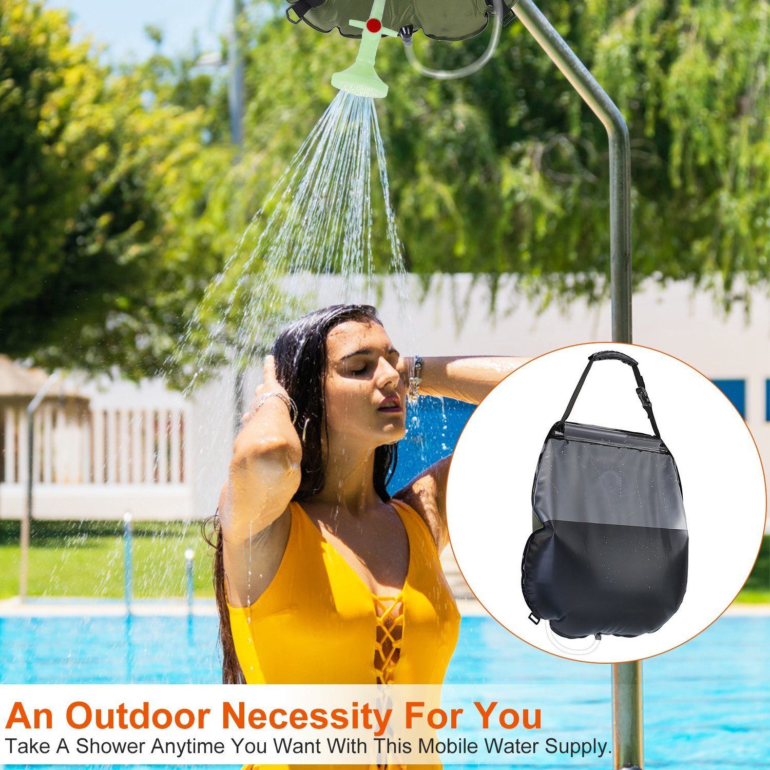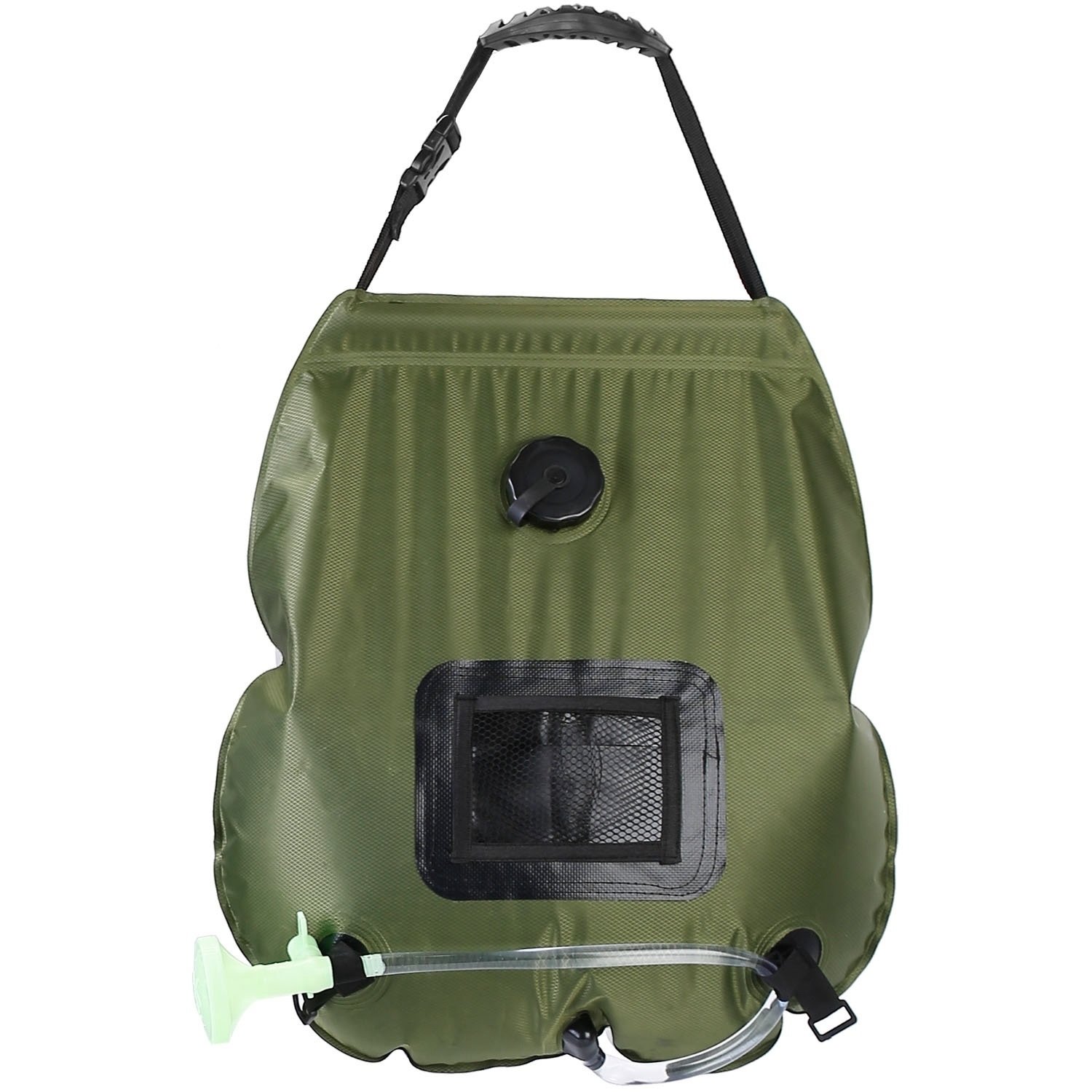 *Humanized Design*:The sturdy handle allows you to hang it on the tree for better heating effect. The strap close to the bottom can be used to fix the hose during shower. Besides; you can put toiletries in the mesh pocket for easy access. Fold it like a bag to save space when not in use.