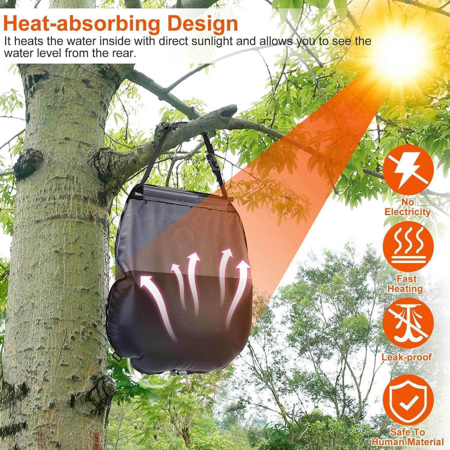 *Heat - absorbing Design*:It heats the water inside up to 45 degree in 3 hrs with direct sunlight. Made of environmental friendly and leak-proof material; it’s safe for human.