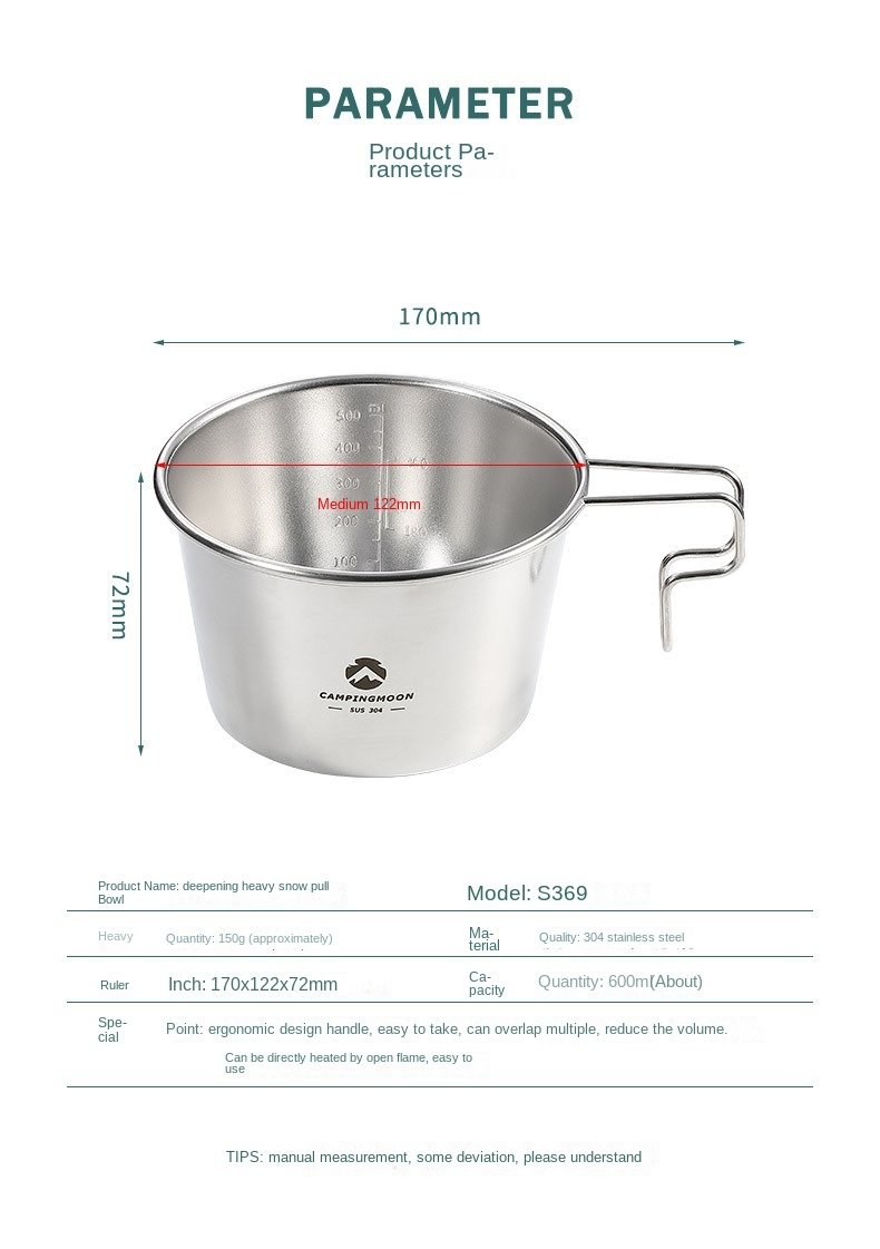 600ml Deepening large-capacity camping supplies with scale camping picnic stainless steel open fire heating snow pull bowl