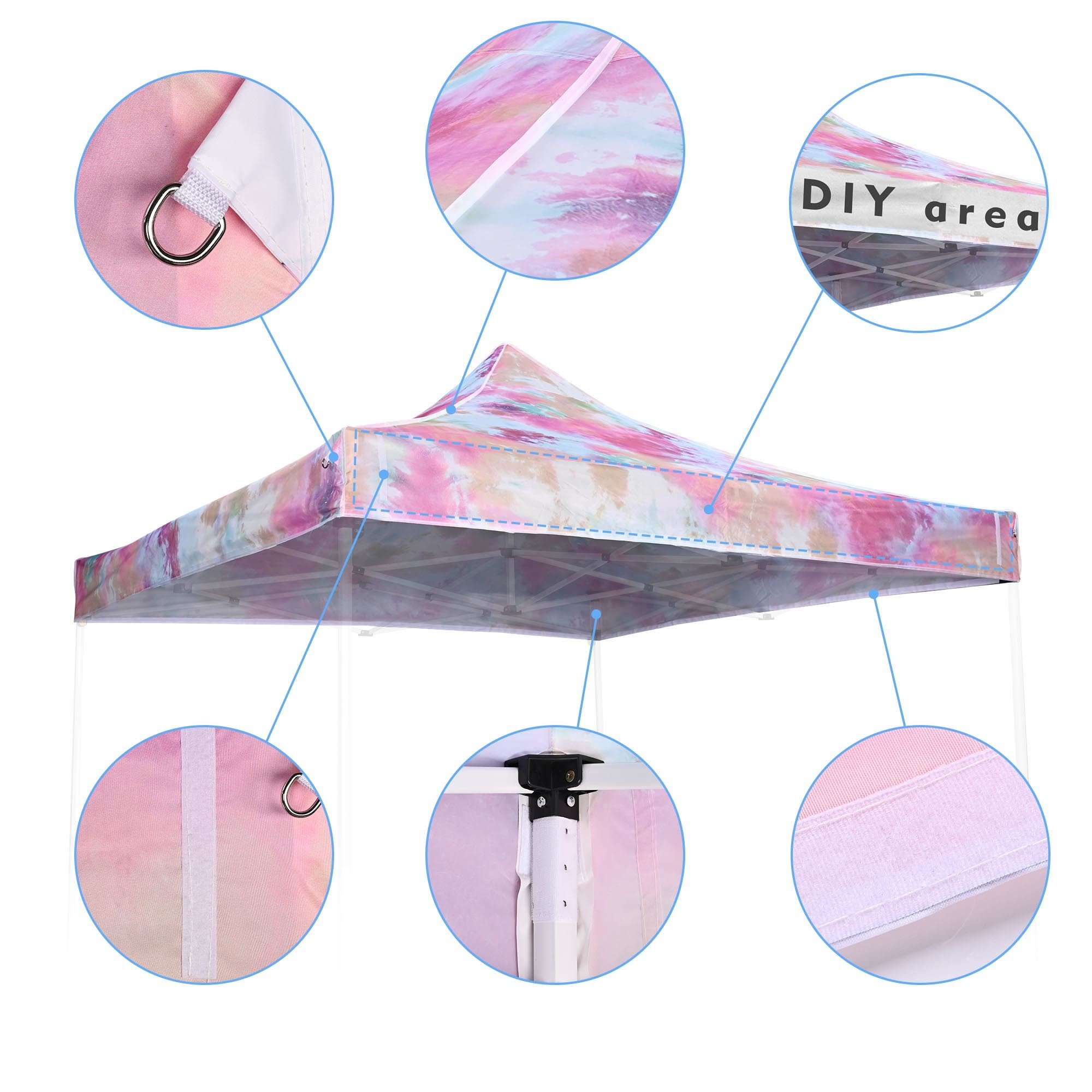 - Easy Installation with Customizable Area - Tool-free installation with self-adhesive straps inside for easily fixing the top to the frame; D-rings on corner for connecting your ropes to further secure the canopy on the lawn with stakes; Loop fasteners on 1 side of the valance for attaching your banner with hook fasteners to display your logo or slogan