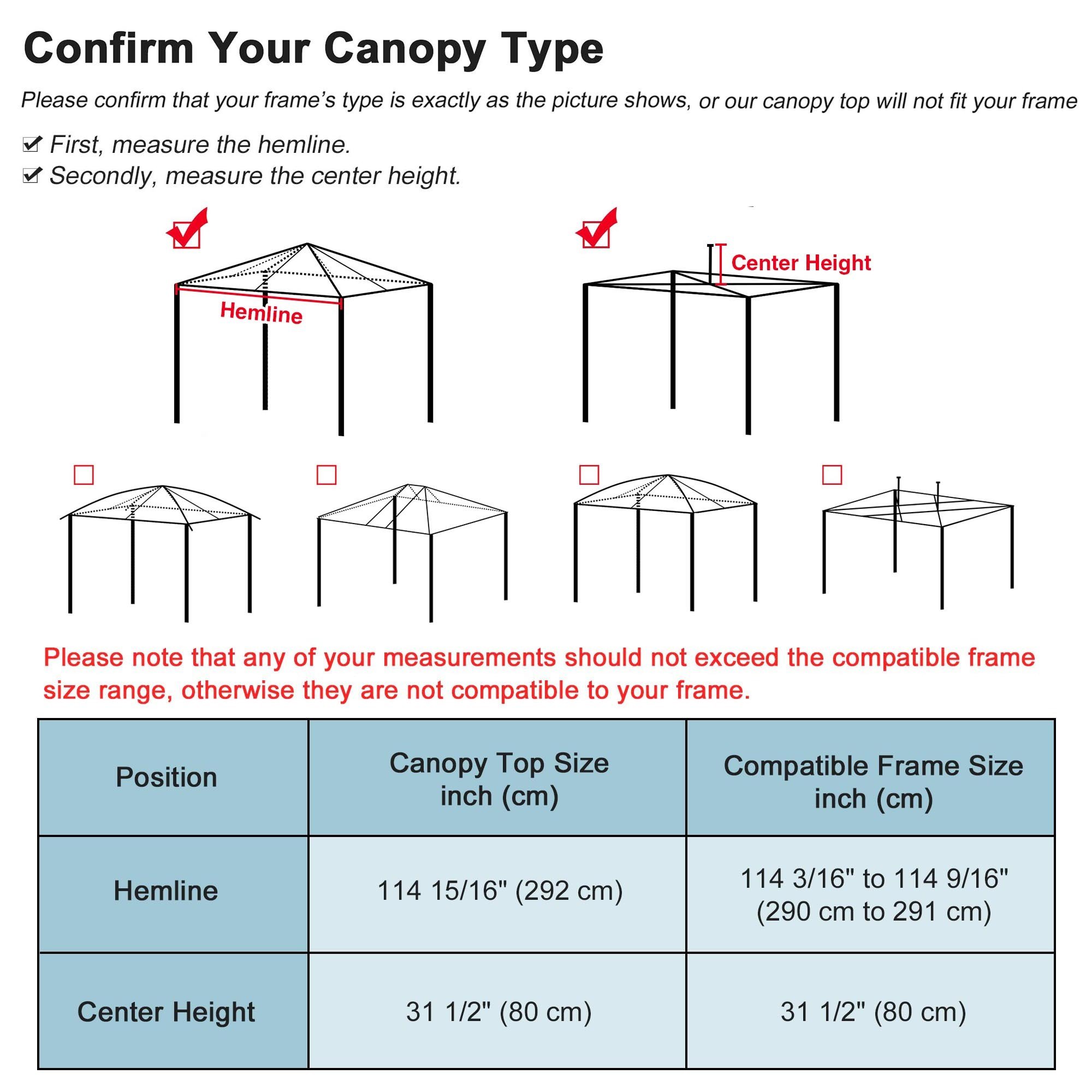 - Measurement Tips - Please measure your canopy frame first, then make sure the length & width are between 114 3/16" and 114 9/16", and the center height equals to 31 1/2"