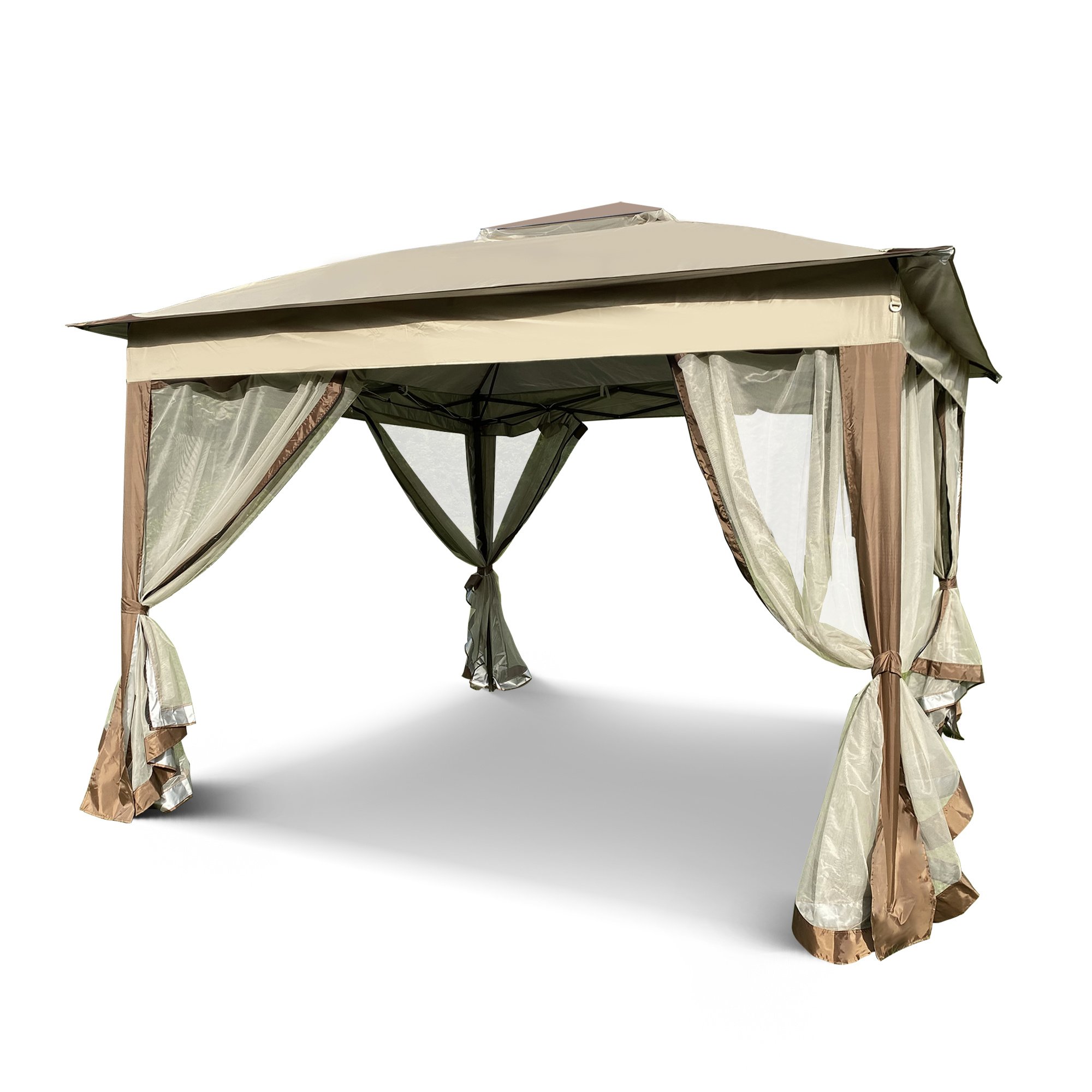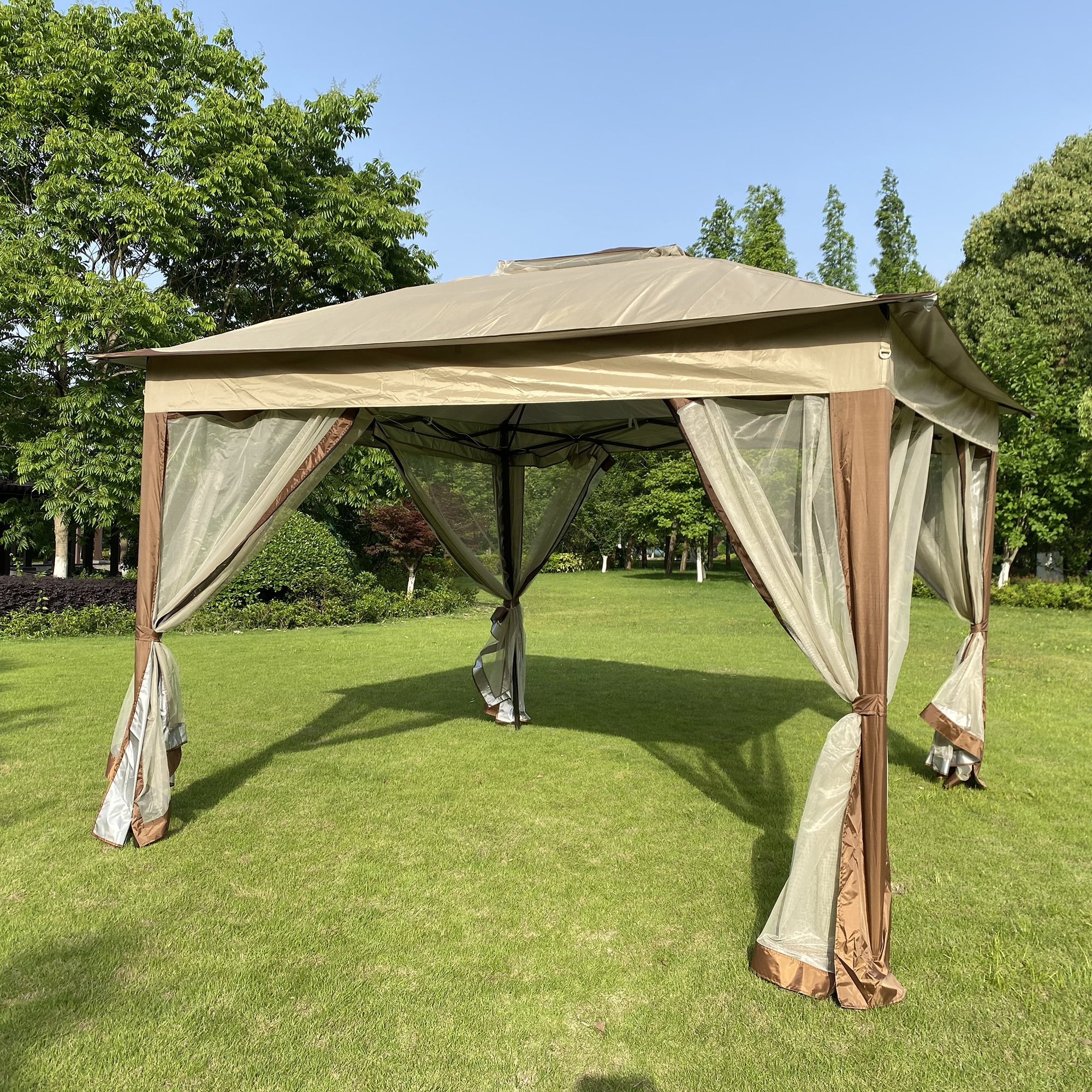 This gazebo can help you to enjoy the extra 11x11 Ft large shading.Combines stunning design qualities with superb craftsmanship, ideal for providing temporary shade for both commercial and household outdoor activities.Keep your outdoor events have a secure shelter with the strong foot pads for optimal support.The double top design still allows for ventilation.