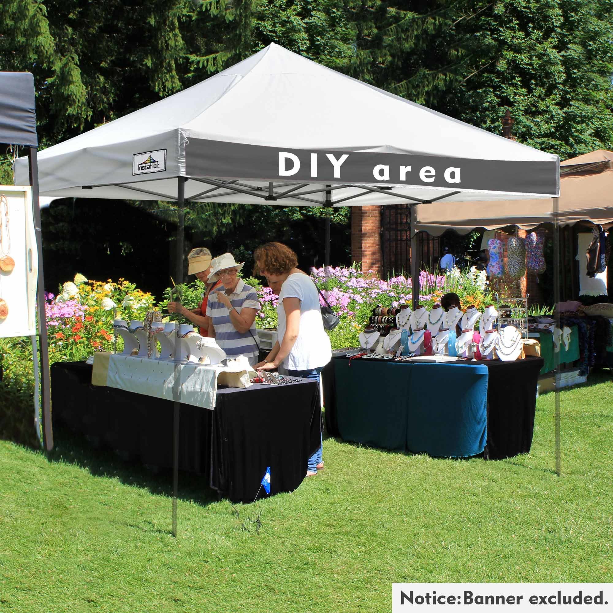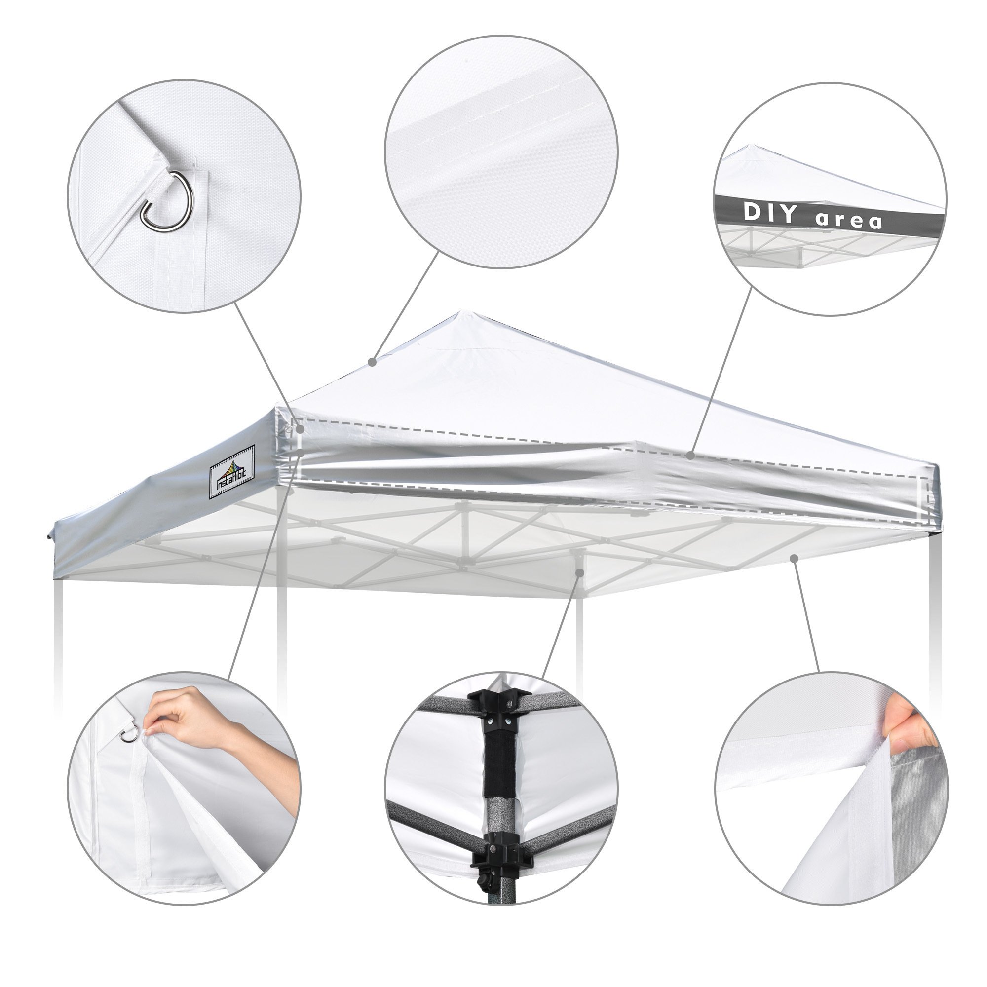 - Easy Installation with Customizable Area - Tool-free Installation; Self-adhesive straps for easy fixing the top to the frame; D-rings on corner for easily fixing with ropes; Loop fasteners inside the hemline for adding sidewalls; Also, loop fasteners on the valance for freely attaching and changing your logo, banner to show your activity theme